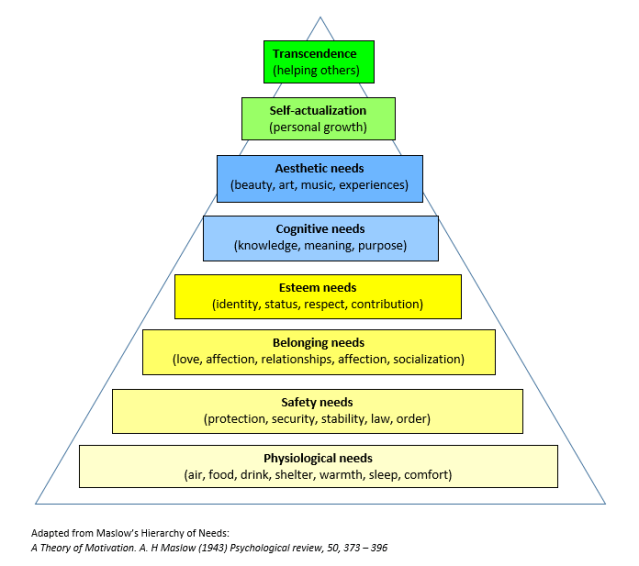 At a time of personal crisis, one concept that helped me understand the turmoil I experienced and assisted me back on the road to recovery was Maslow’s Hierarchy of Needs. For those unfamiliar, Maslow was a psychologist who came up with a pyramidal concept of needs. There were five initial levels that later evolved to eight and (working from bottom to top) encompass basic needs (physiological, safety, belonging, esteem), mid-level development (cognitive, aesthetics), and top level needs of personal growth and striving for the greater good. Maslow postulated that one’s lower needs had to be met before one could move on to mid-range then higher level needs.